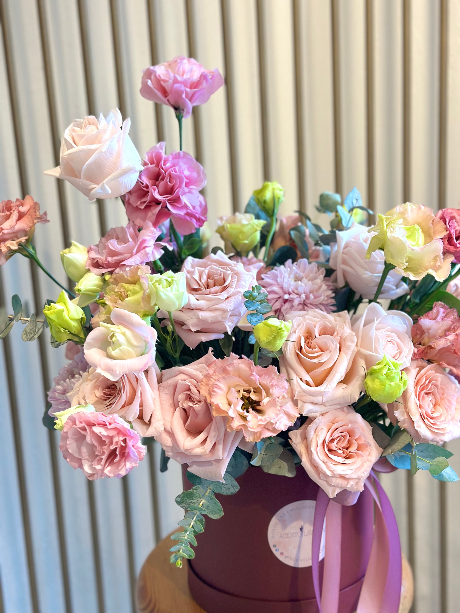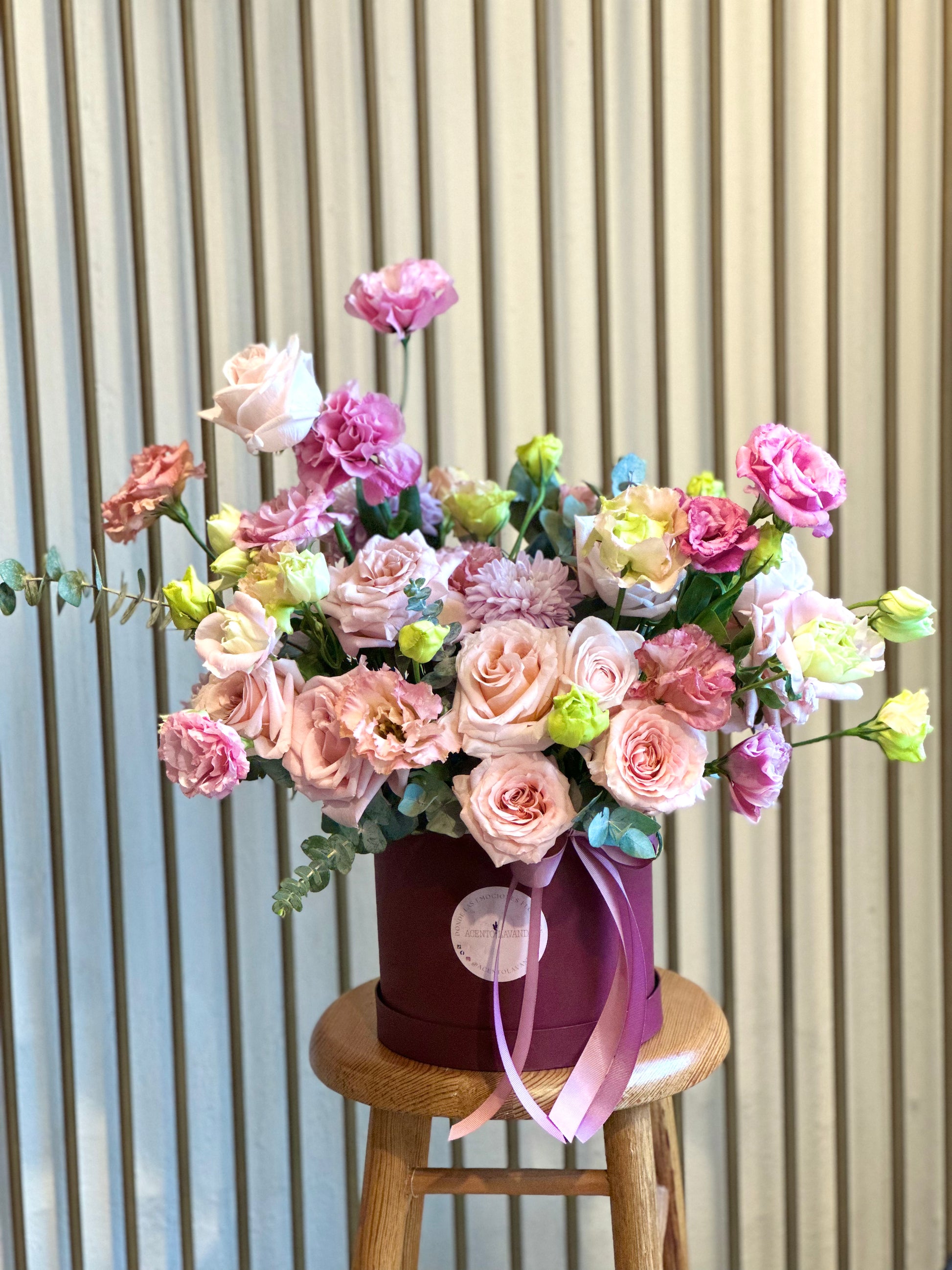 Hermosa caja color tinto con variedad de rosas y lisianthus en tonos pastel.