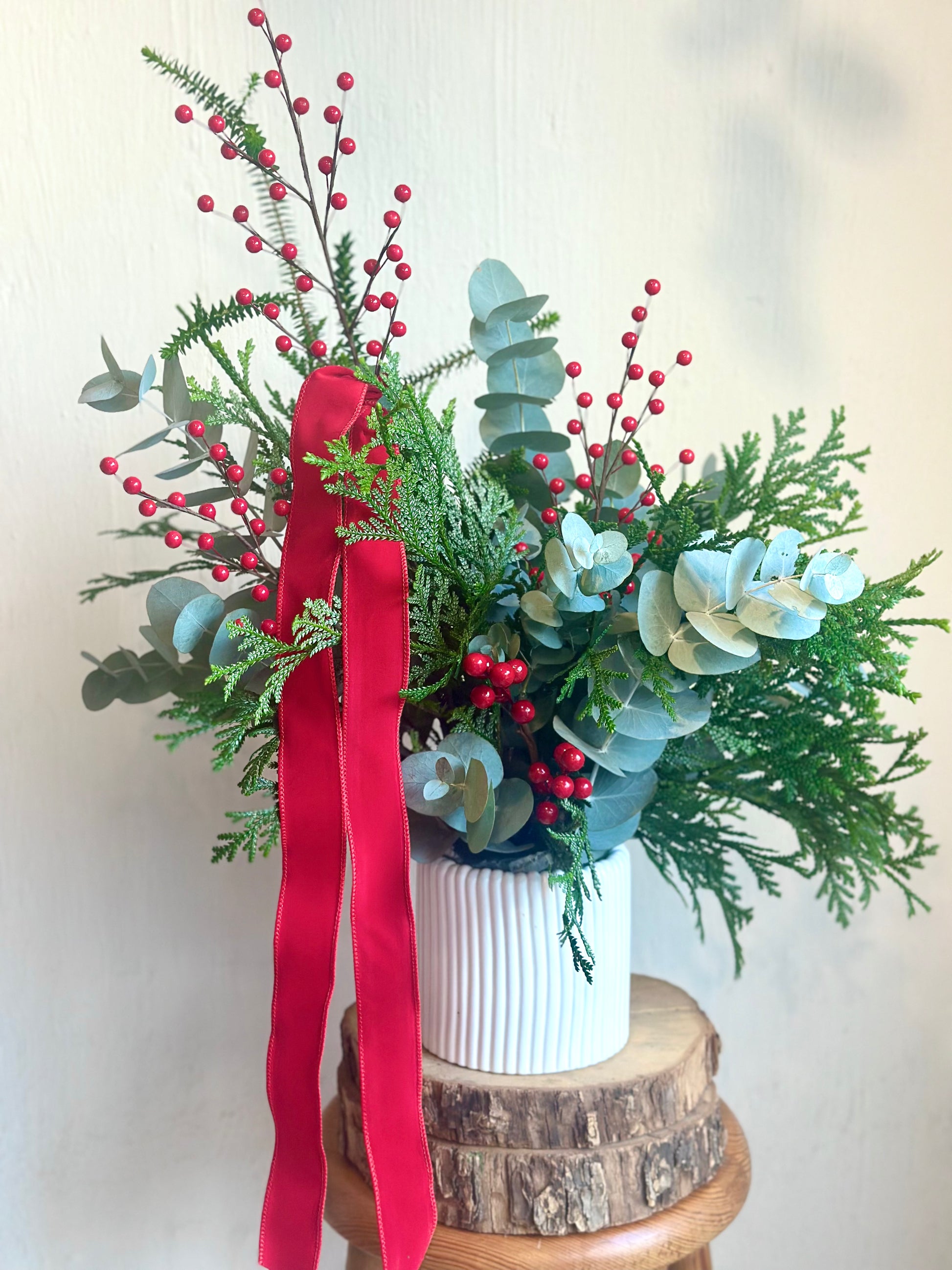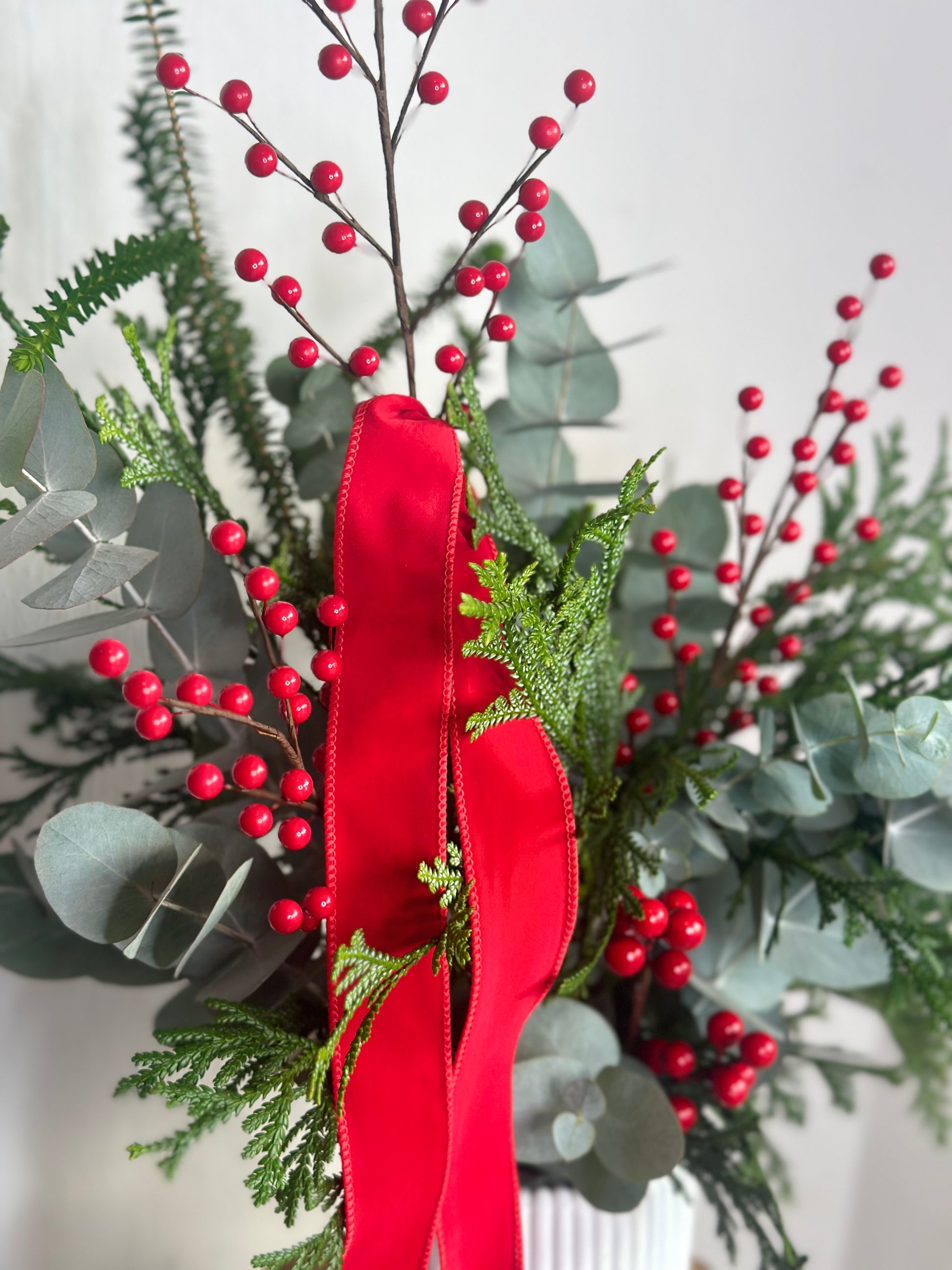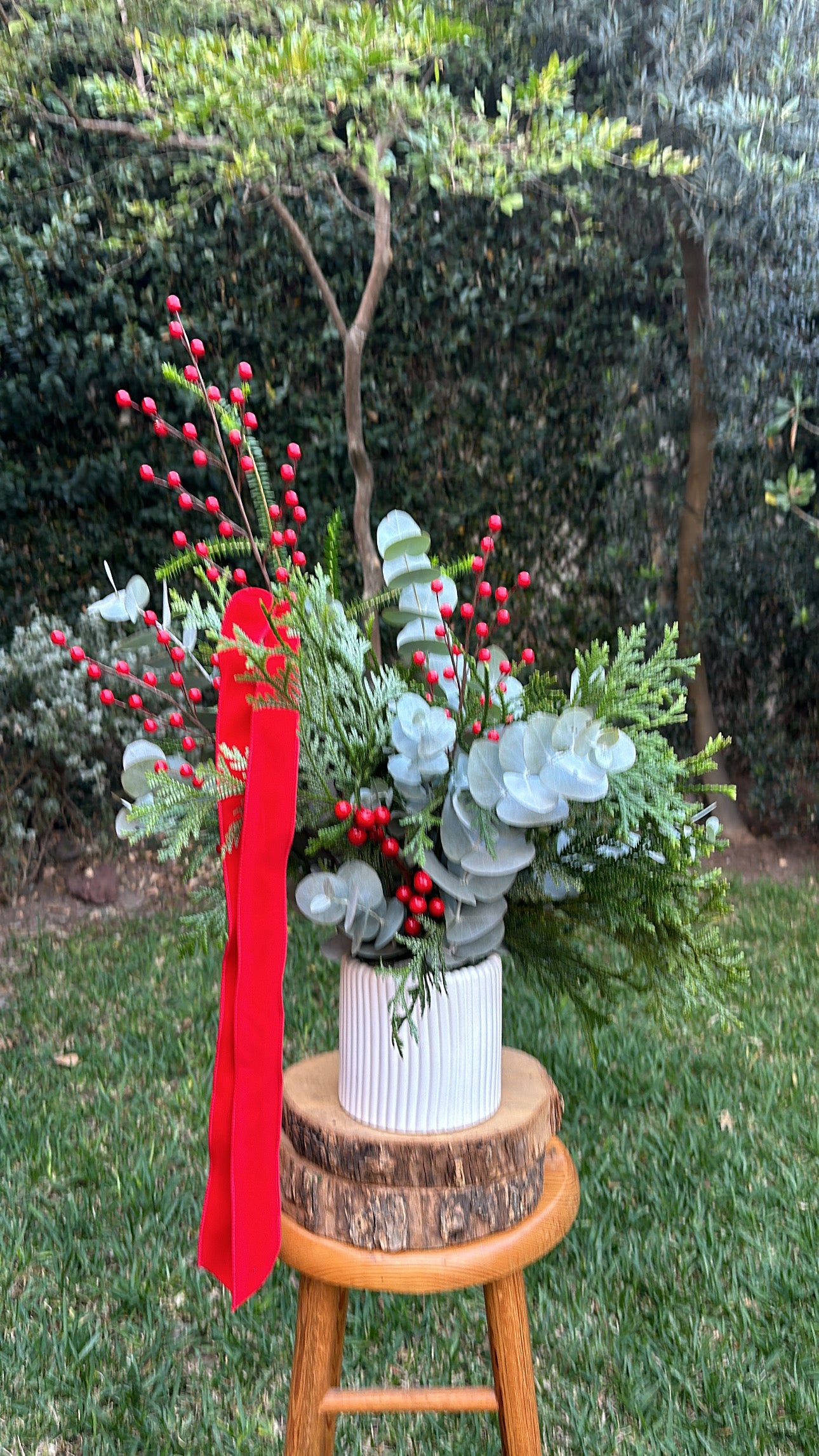 Lleva el aroma de la navidad a tu hogar. Base cerámica blanca con follajes de eucaliptos, pinos y bolitas rojas artificiales. Medidas aproximadas 60 x 50 cm